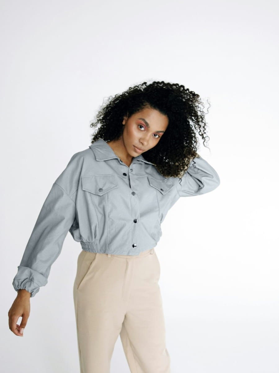 Denim-style cotton fabric. Bomber design. Round neck. Long sleeve. Two front pockets.